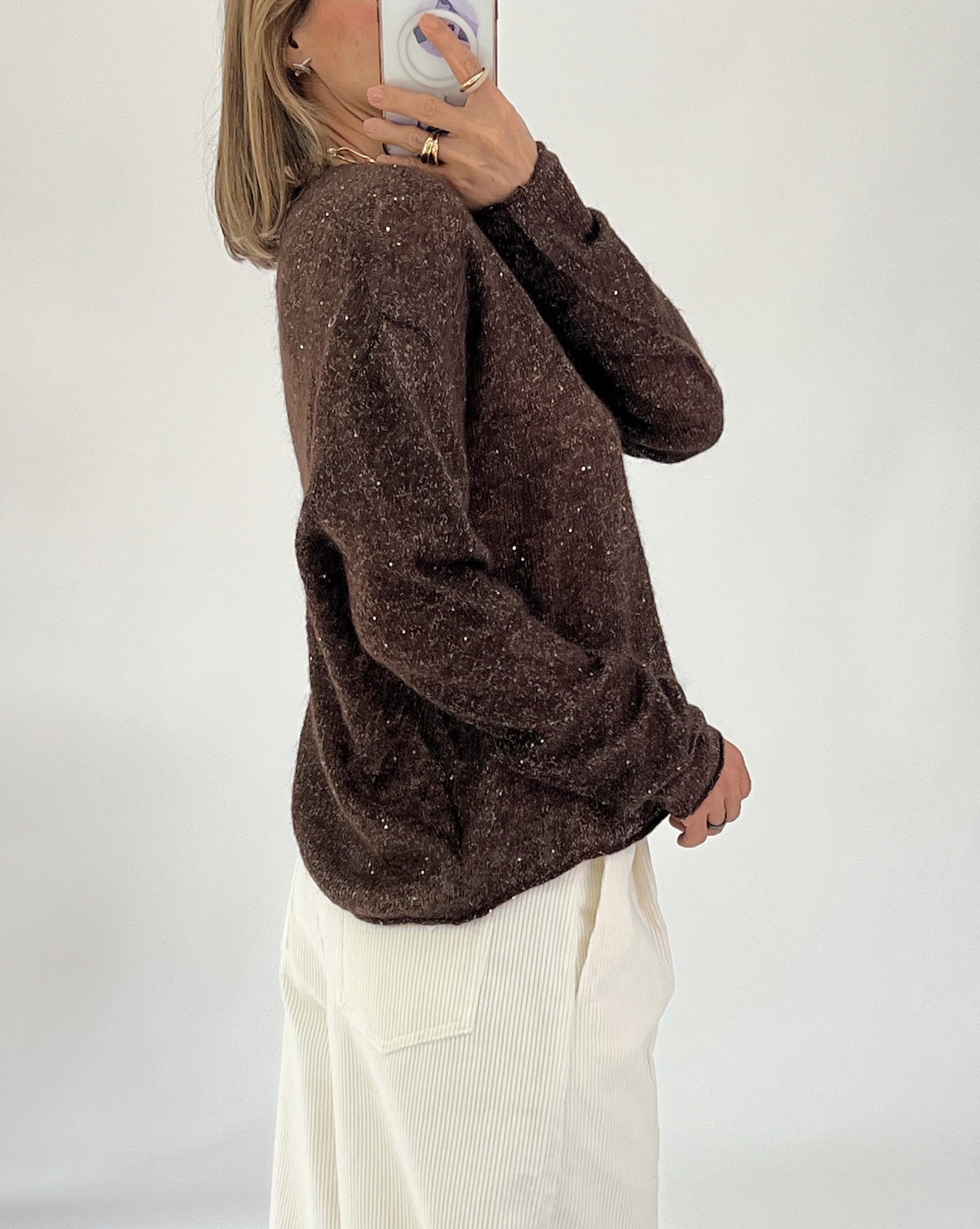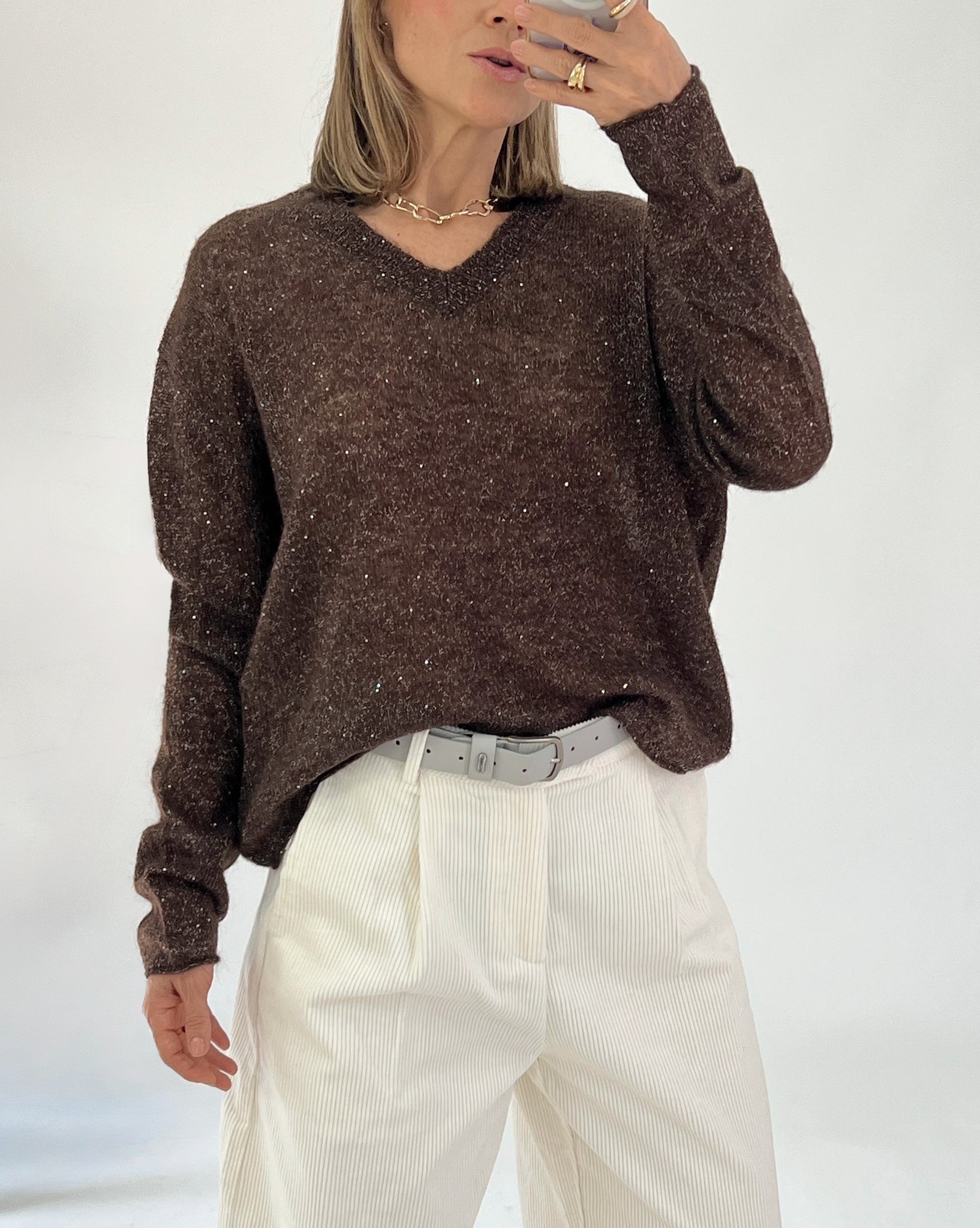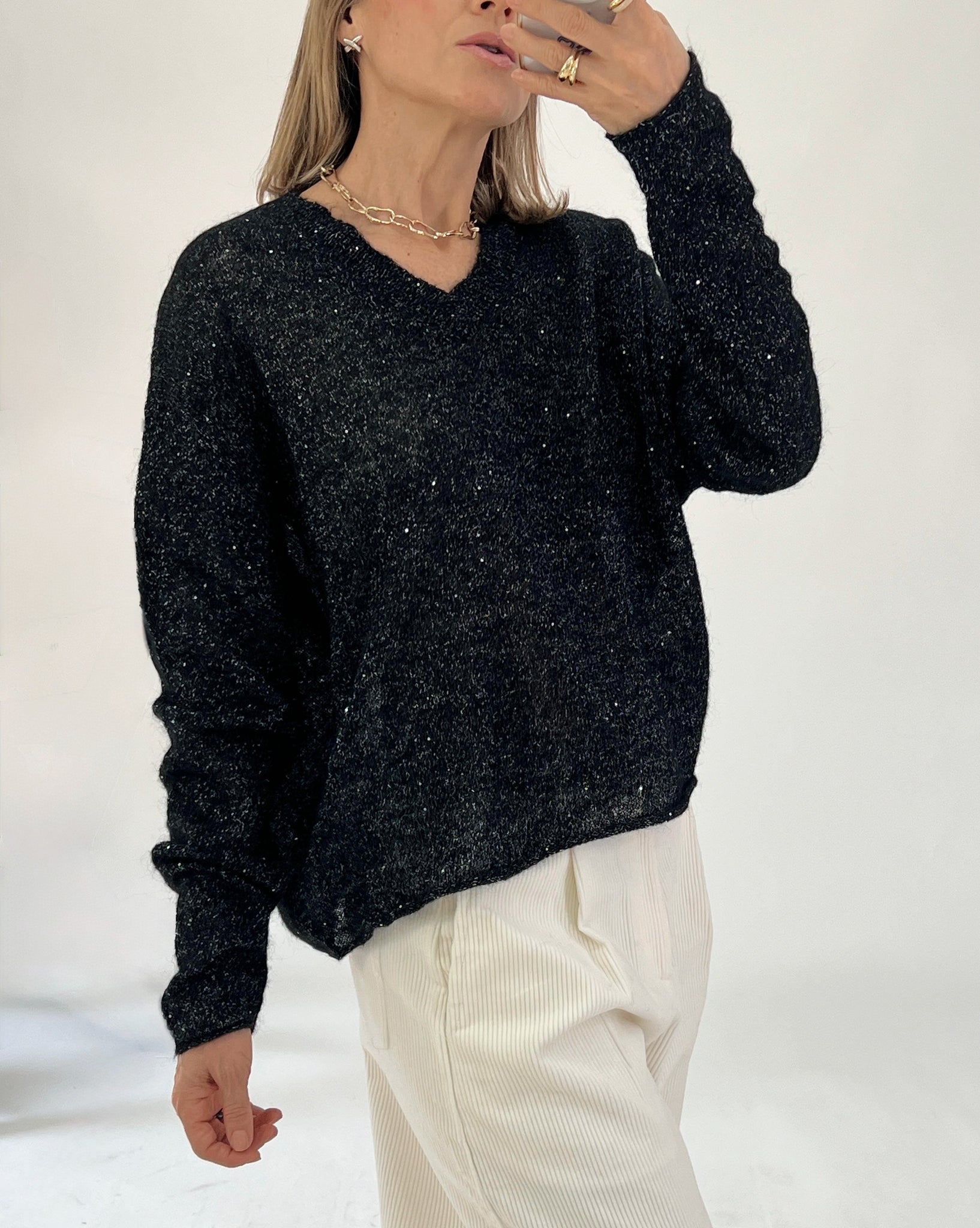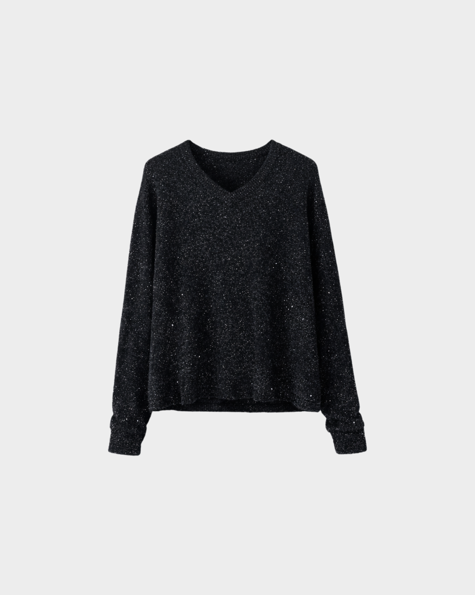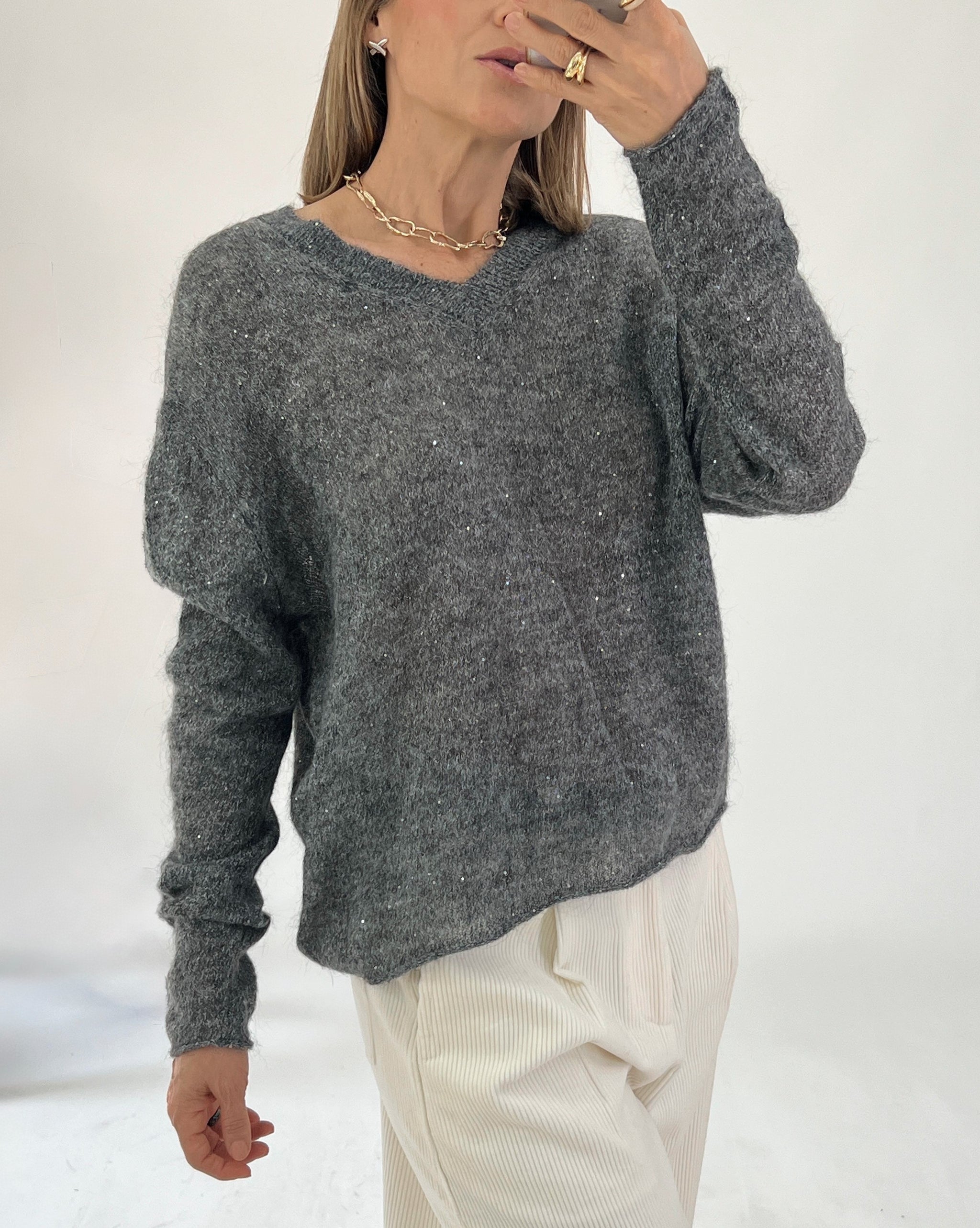 Sweater Top made from a wool blend fabric. V-neck. Long sleeves. Finished with small sequins. Soft fabric that is pleasant to the touch.