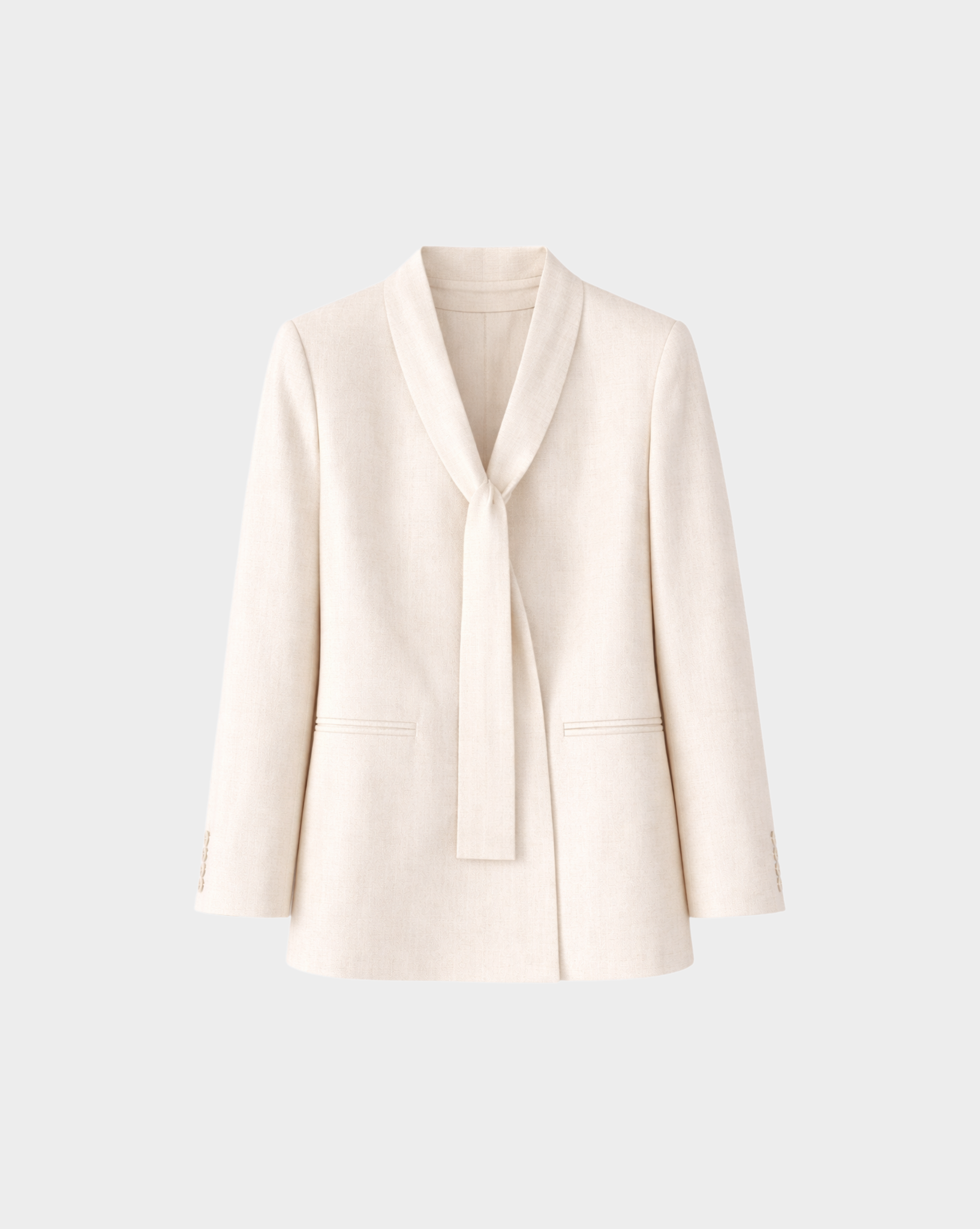 A timeless blazer in ivory with tie/belt, side belt loops, faux front pockets, and three-button cuffs.
